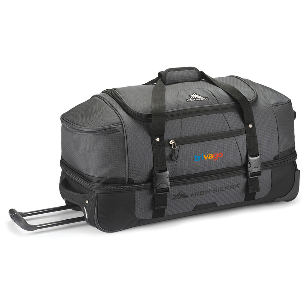 Plan your next trip with a custom Gemline High Sierra Mercury/Black Fairlead 28" Drop Bottom Wheeled Duffel in mercury/black. This medium-sized duffel with wheels and a retractable trolley handle is a great option for a road trip to your favorite destination or a flight across the country. Ideal as a gift for those moving out, starting school, or hitting the road.