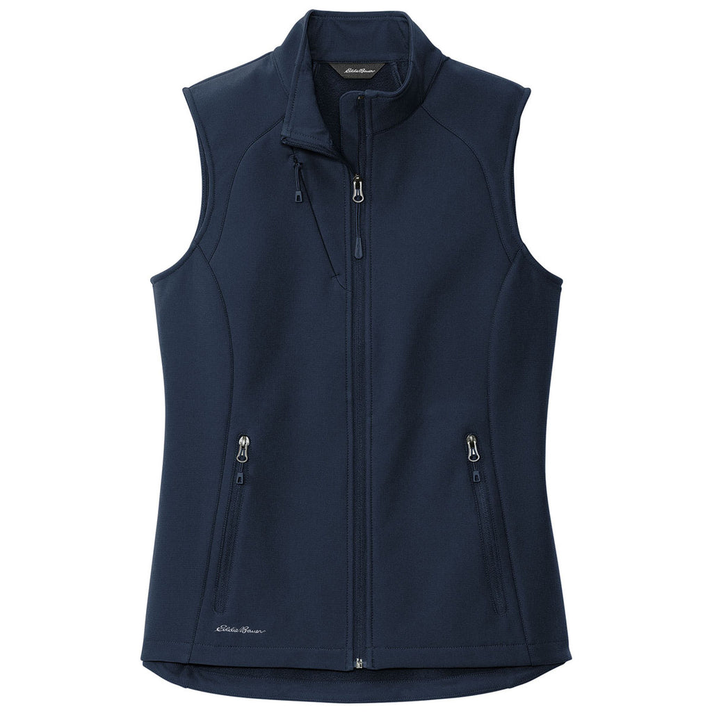 Order the Eddie Bauer Women's River Blue Navy Stretch Soft Shell Vest for extra warmth on a chilly night. Easily layer with any dress shirt for a professional corporate look. Fleece lining for a soft and comfortable fall day. Add a custom logo and broadly display your company's brand.