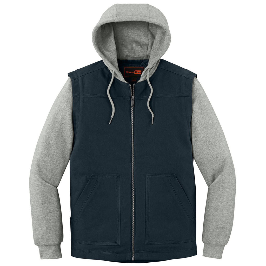 Corporate workwear is elevated with the CornerStone Men's Navy/Heather Grey Duck Fleece Full-Zip Hooded Jacket. Built tough with a rugged exterior and warm fleece lining, it's designed for job sites and outdoor wear. Add your custom logo to make it a dependable piece of branded apparel that keeps your team protected while representing your company.