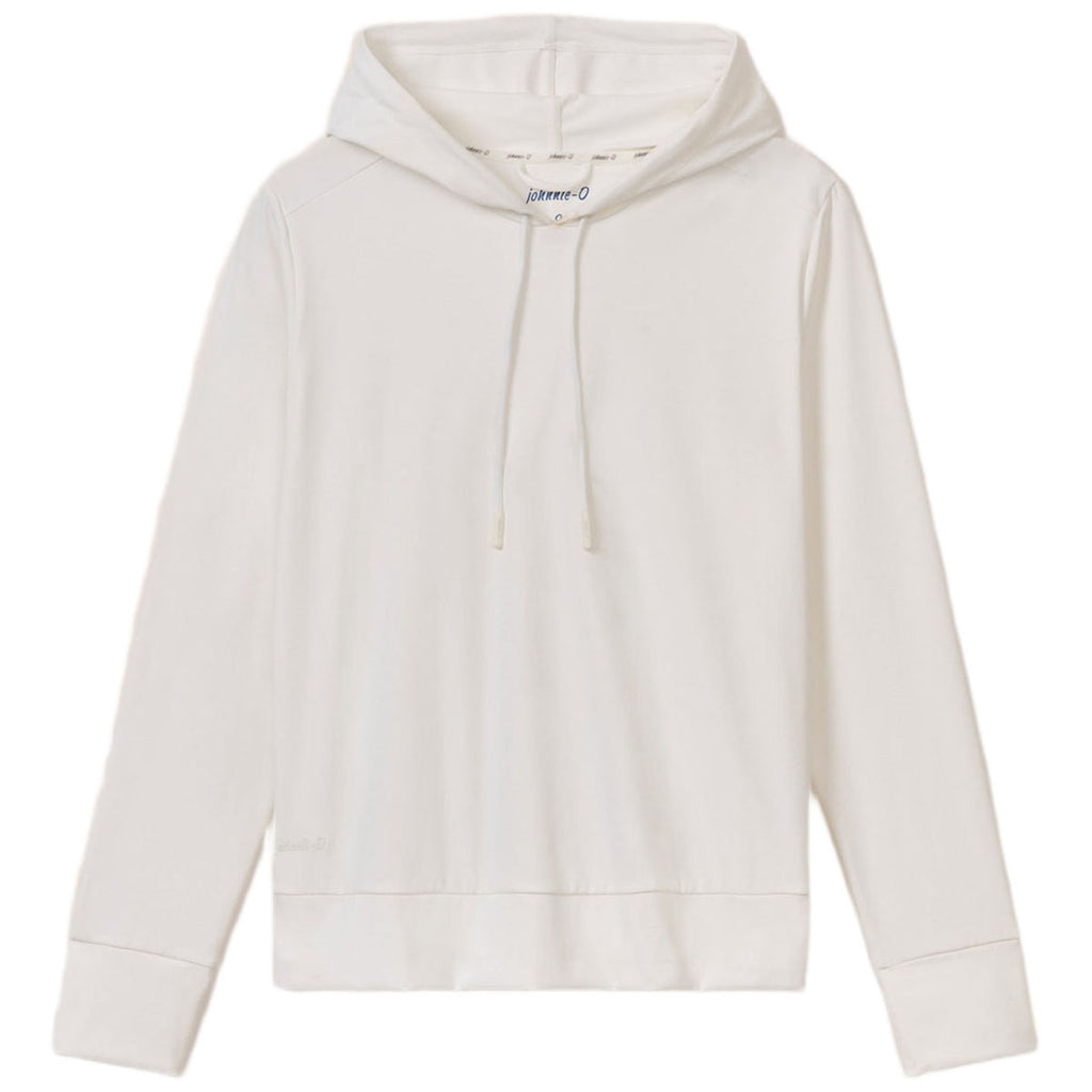 The Johnnie-O Women's White Nalla Performance Hoodie blends athletic comfort with a sleek silhouette, which is excellent for custom or corporate orders. Ideal for cool mornings or active days, it offers lightweight layering that moves with you. A go-to piece for branded wellness initiatives or stylish personal wear, it combines function and flattering form.Highlights