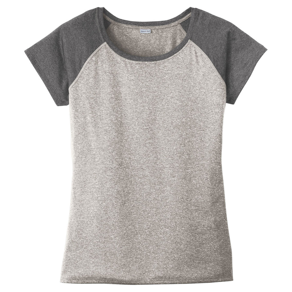 Become a corporate apparel contender by wearing the custom printed Sport-Tek Women's Vintage Grey Heather-On-Heather Contender Scoop Neck Tee. The chic scoop neck tee comes with a snag resistant polyester jersey fabric that maintains its look for years to come. Moisture wicking technology cools the skin to keep you energized throughout the day. Add your corporate logo on the large imprint area to build brand awareness in your products and services. The color block design gives you the ultimate in fashion flexibility. Contrast raglan sleeves and the curved drop tail hem seal the stylish corporate apparel deal.Corresponding Men's Style: Sport-Tek Men's Vintage Grey Heather-On-Heather Contender Tee