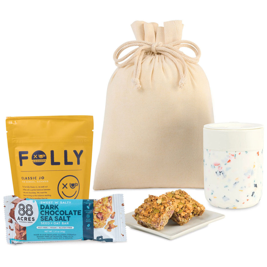 The Gourmet Expressions Cream Terrazzo But First...Coffee Gift Set with a corporate logo is ideal as a caffeine-infused way to showcase your brand. Including premium coffee and a stylish mug, this gift set is perfect for employees, clients, or corporate events. A personalized gift that's sure to make a lasting impression with every sip.The minimum order for this product is 12 pieces.