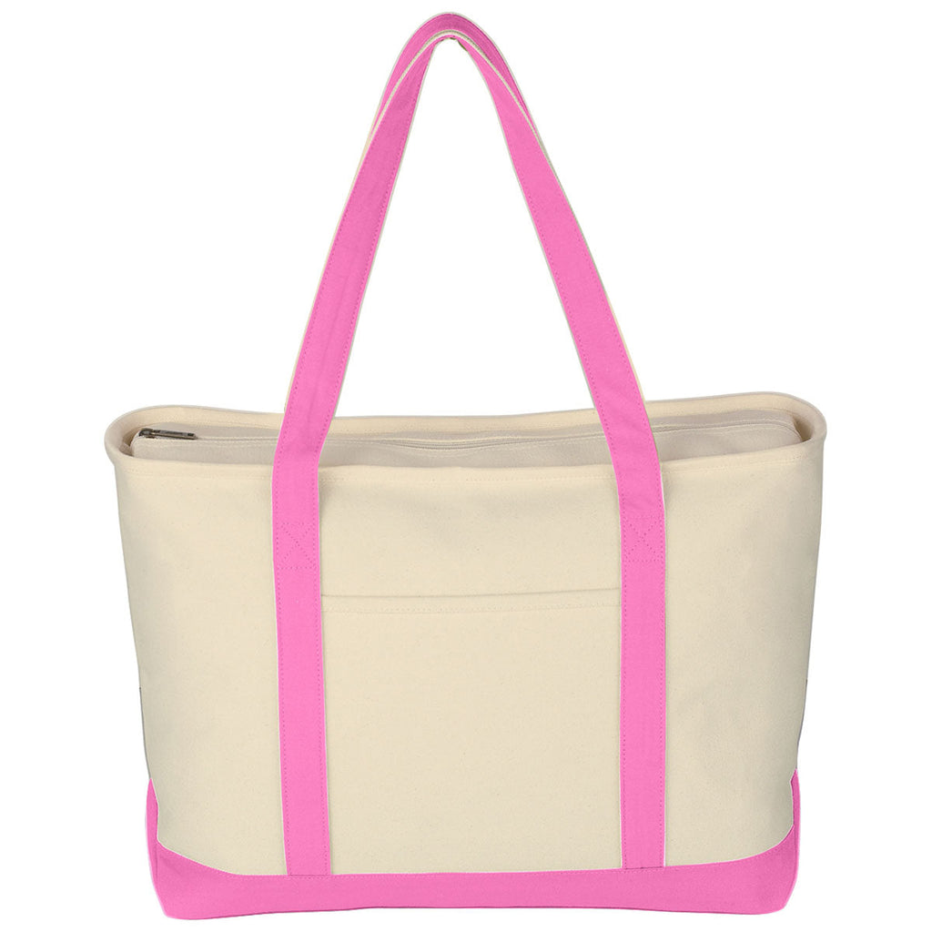 Enjoy the Hit Natural/Pink Large Starboard Cotton Canvas Tote Bag with a custom logo. This neutral color bag has a bottom panel and shoulder straps in several color options to fit your needs. The ideal option for the beach, park, or road trip, the roomy tote zips closed for convenience. Give as a gift or add to your logoed items for sale.