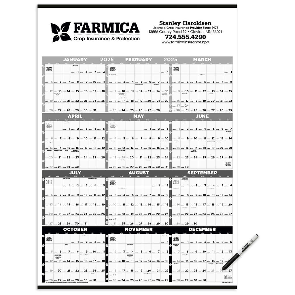 Triumph Calendars Black & White Black & White Time Management Span-A-Year Laminated calendar with a corporate logo is a fun and simple way to help keep clients, staff, and yourself organized. Your schedule can be found at a glance with this laminated calendar with a marker included but not attached. Place your order today.The minimum order for this product is 100 pieces.