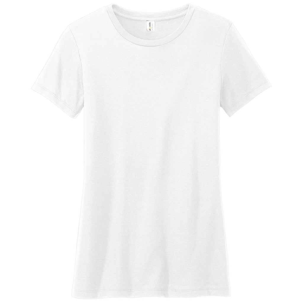 Design screen print for the Allmade Women's Bright White Tri-Blend Tee for a sustainable clothing option that is comfortable and good for the environment. Add a company logo to use as employee apparel that also doubles as recycled apparel for the more conscientious employees. Made partially of recycled materials that are the equivalent of up to six plastic water bottles, this rib neck women's tee is gorgeous and durable. Add a custom logo to support a local team or give as a custom gift that can be worn as often as desired.