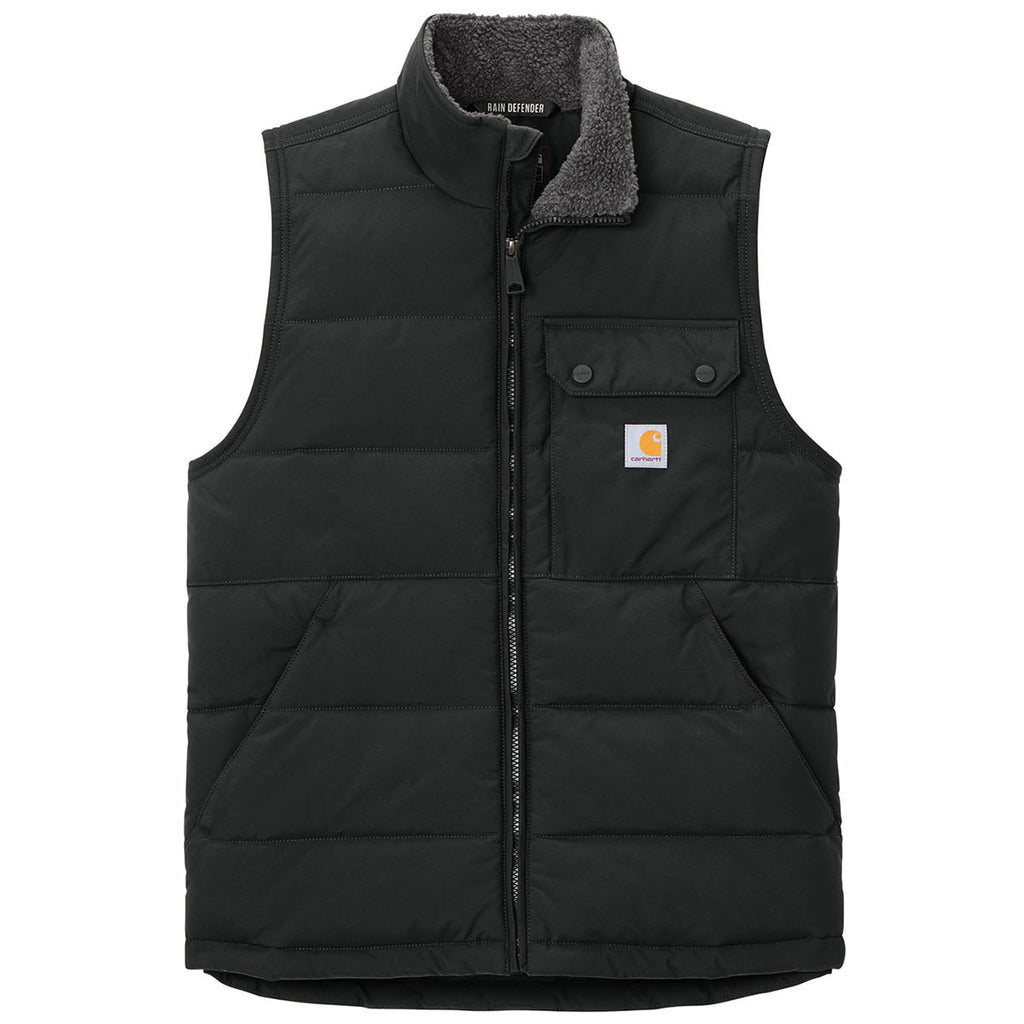Layer with confidence in the Carhartt Men's Black Montana Insulated Vest. This vest offers core warmth without restricting movement, making it ideal for outdoor work or casual wear. A custom logo transforms it into durable corporate apparel that's both practical and professional. Its rugged build ensures long-term wear, making it an excellent investment for branded uniforms or gifts.