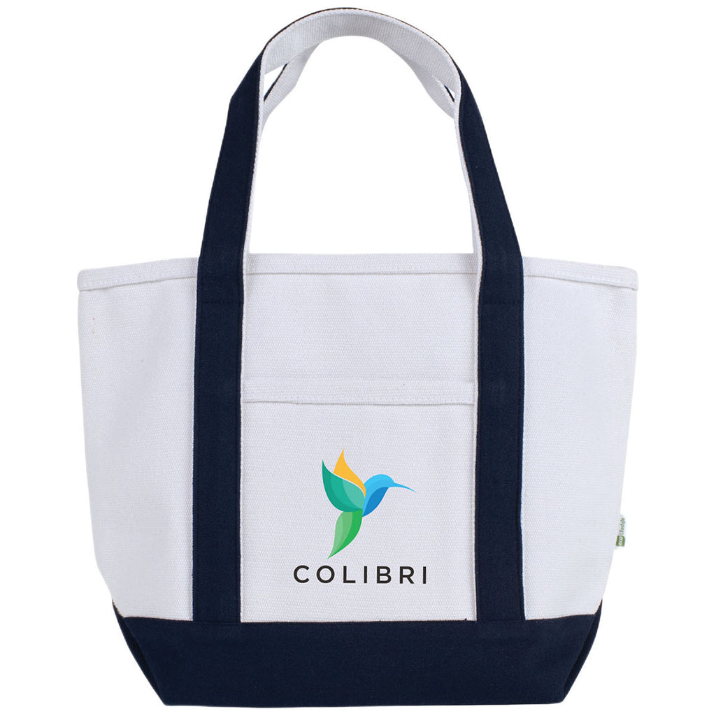 The Logomark Navy Roan Mini 24 oz. Recycled Canvas Tote is a custom favorite for boutiques, welcome kits, or eco-friendly events. Made from recycled cotton, it's compact, durable, and reusable. Ideal for carrying essentials, packaging gifts, or adding a sustainable twist to your logoed merchandise.