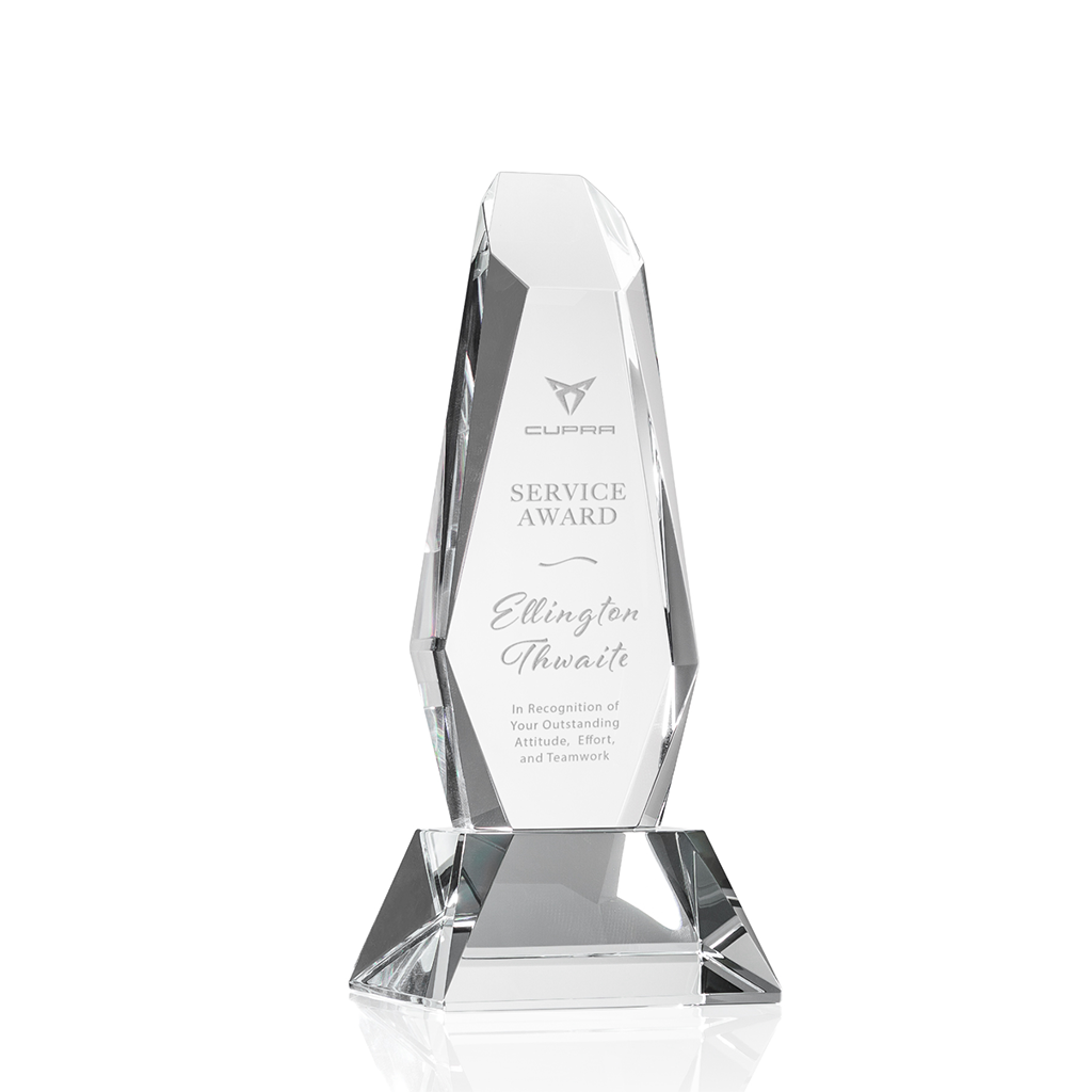 The St. Regis Clear Rawlinson Award on Base 10" is a monolithic optical crystal statue of excellence. With angular, beveled sides and top, this dazzling recognition sculpture is a sight to behold.The minimum order for this product is 1 piece.